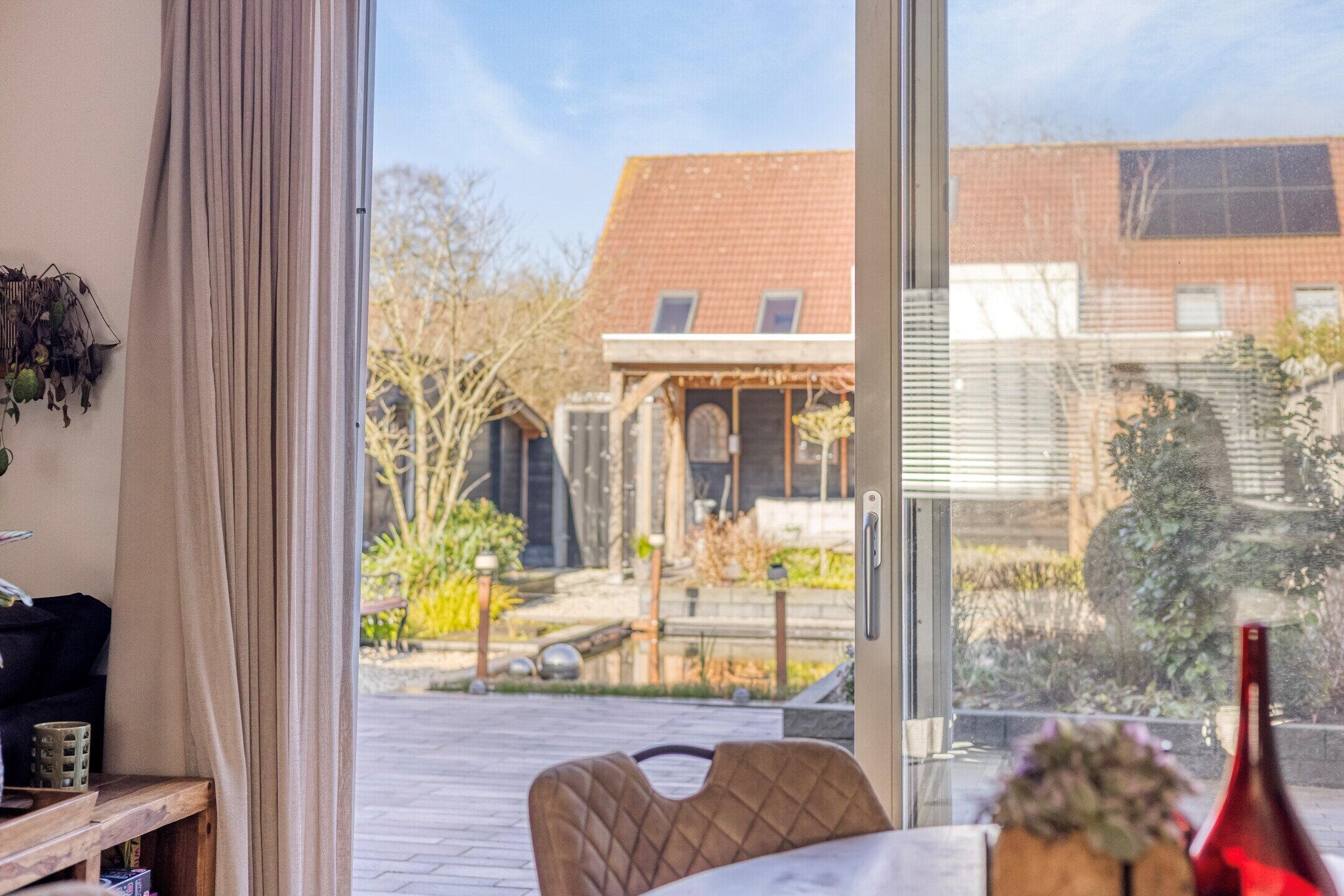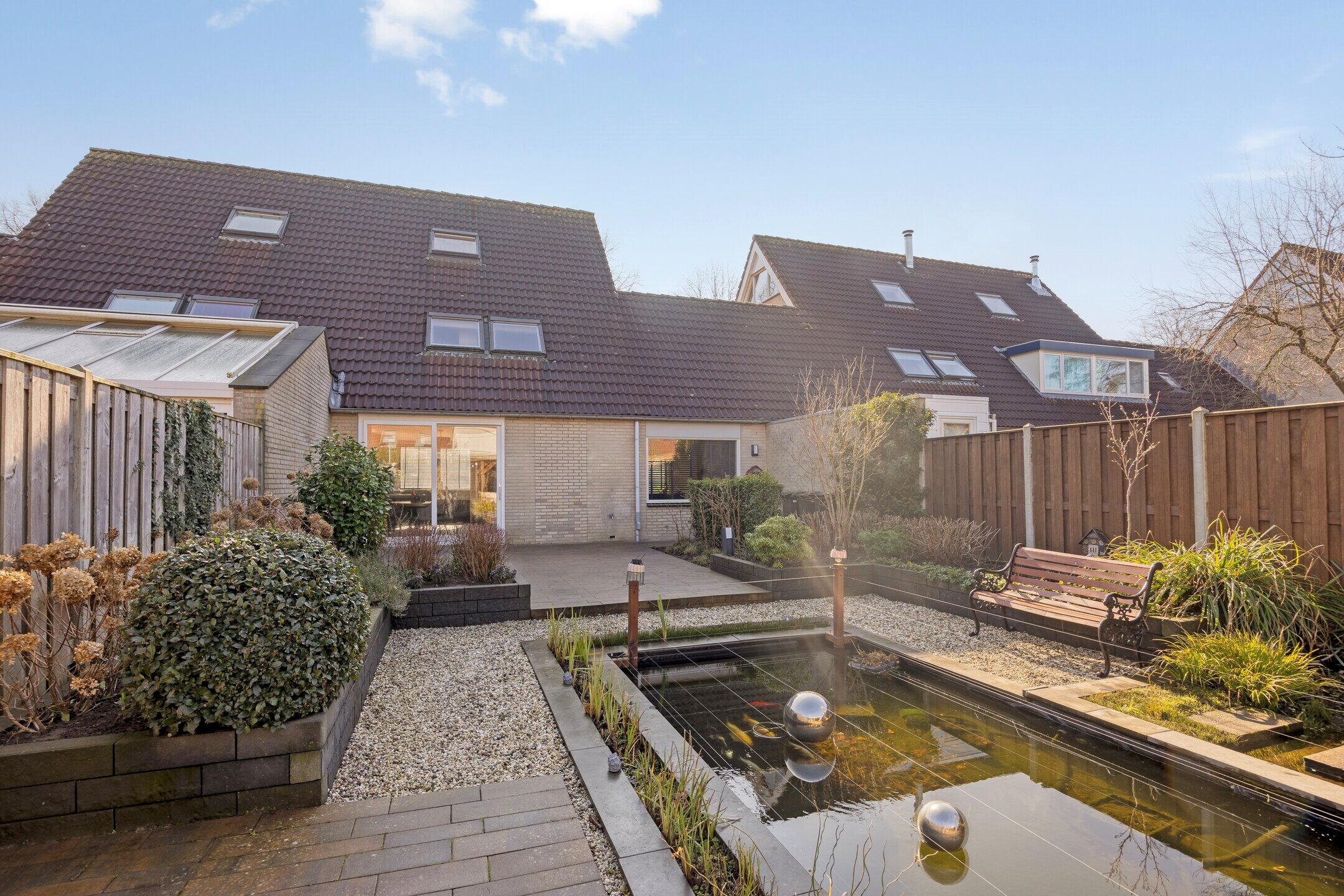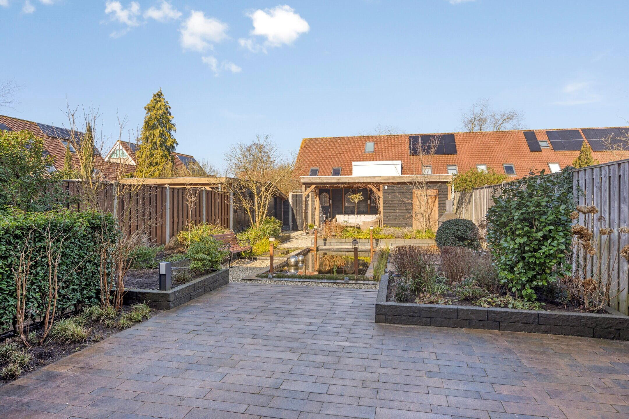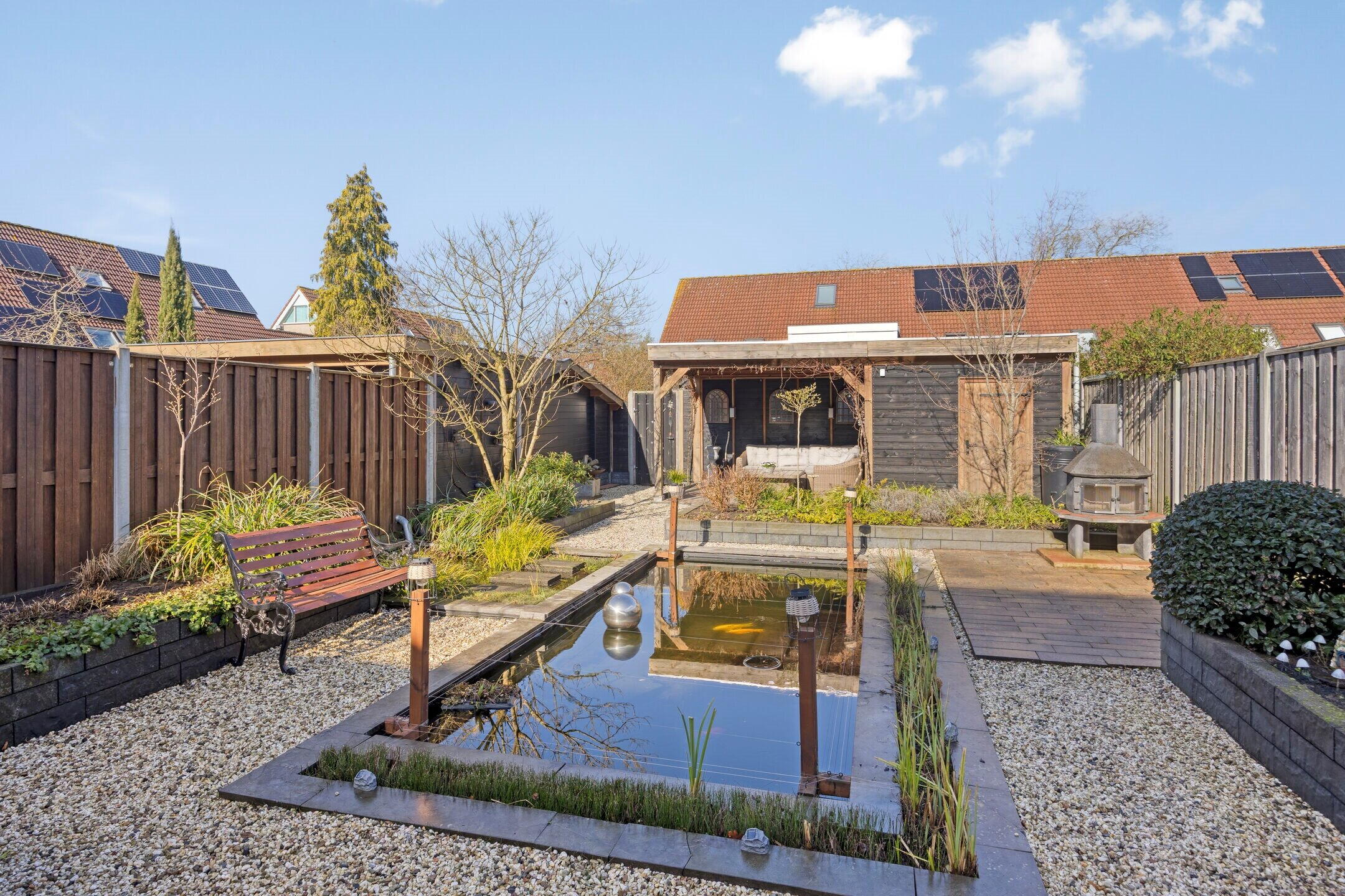 • Riante achtertuin van ca. 171 m² met vijver, overkapping en berging