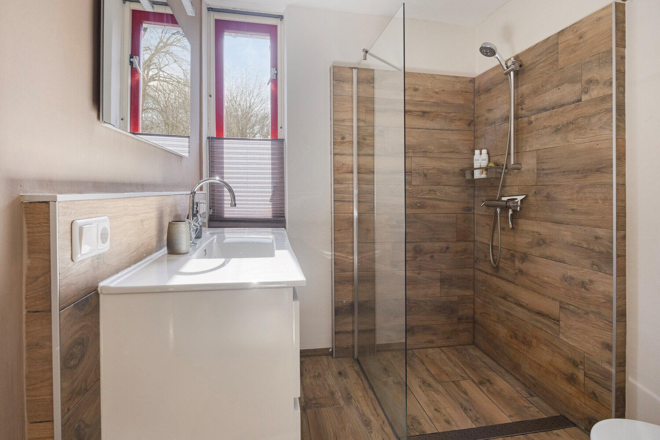 De badkamer is verzorgd en voorzien van een inloopdouche, toilet en een wastafel met meubel.