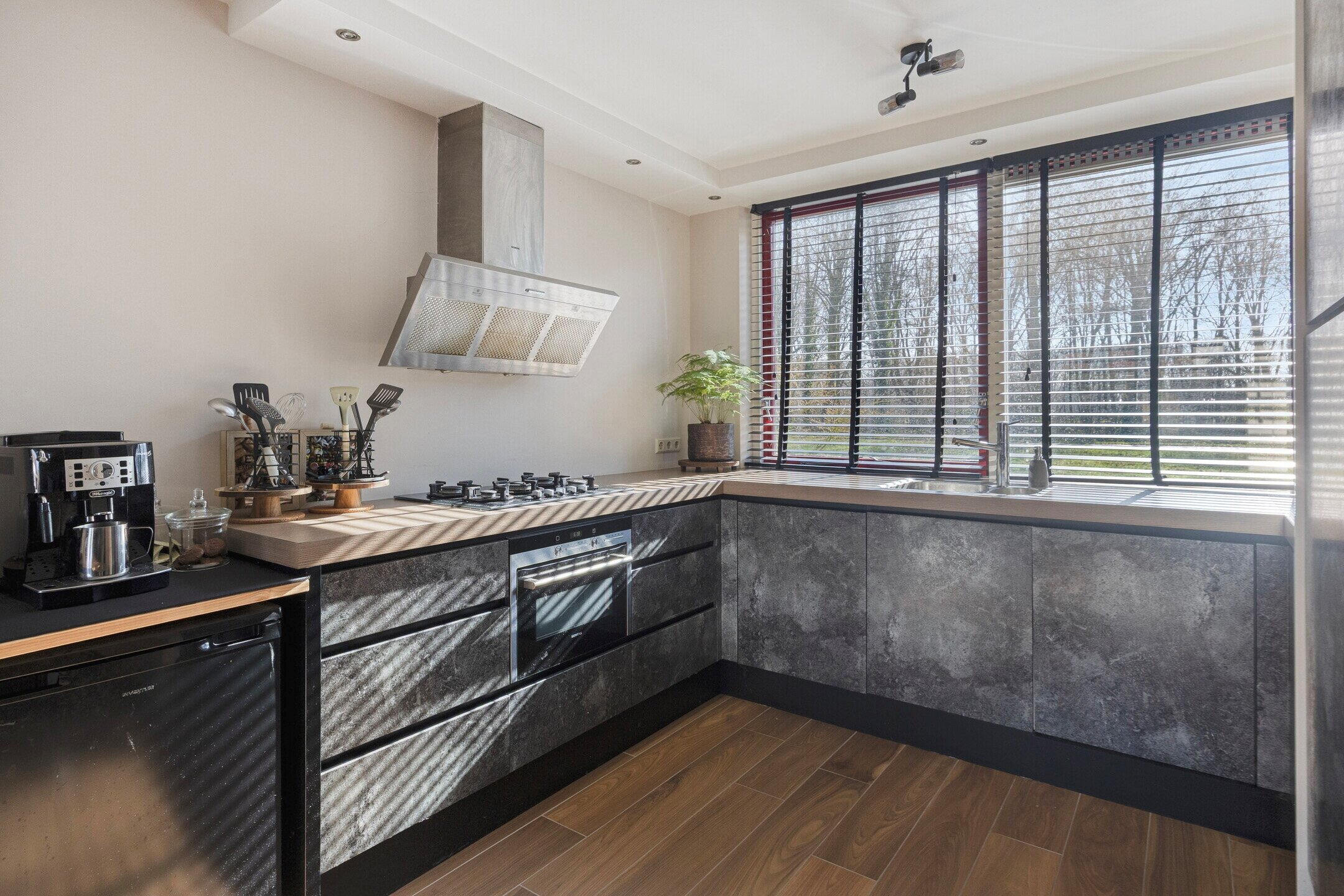 De keuken is praktisch ingericht en voorzien van diverse inbouwapparatuur, waaronder een oven, vaatwasser, gaskookplaat en afzuigkap.