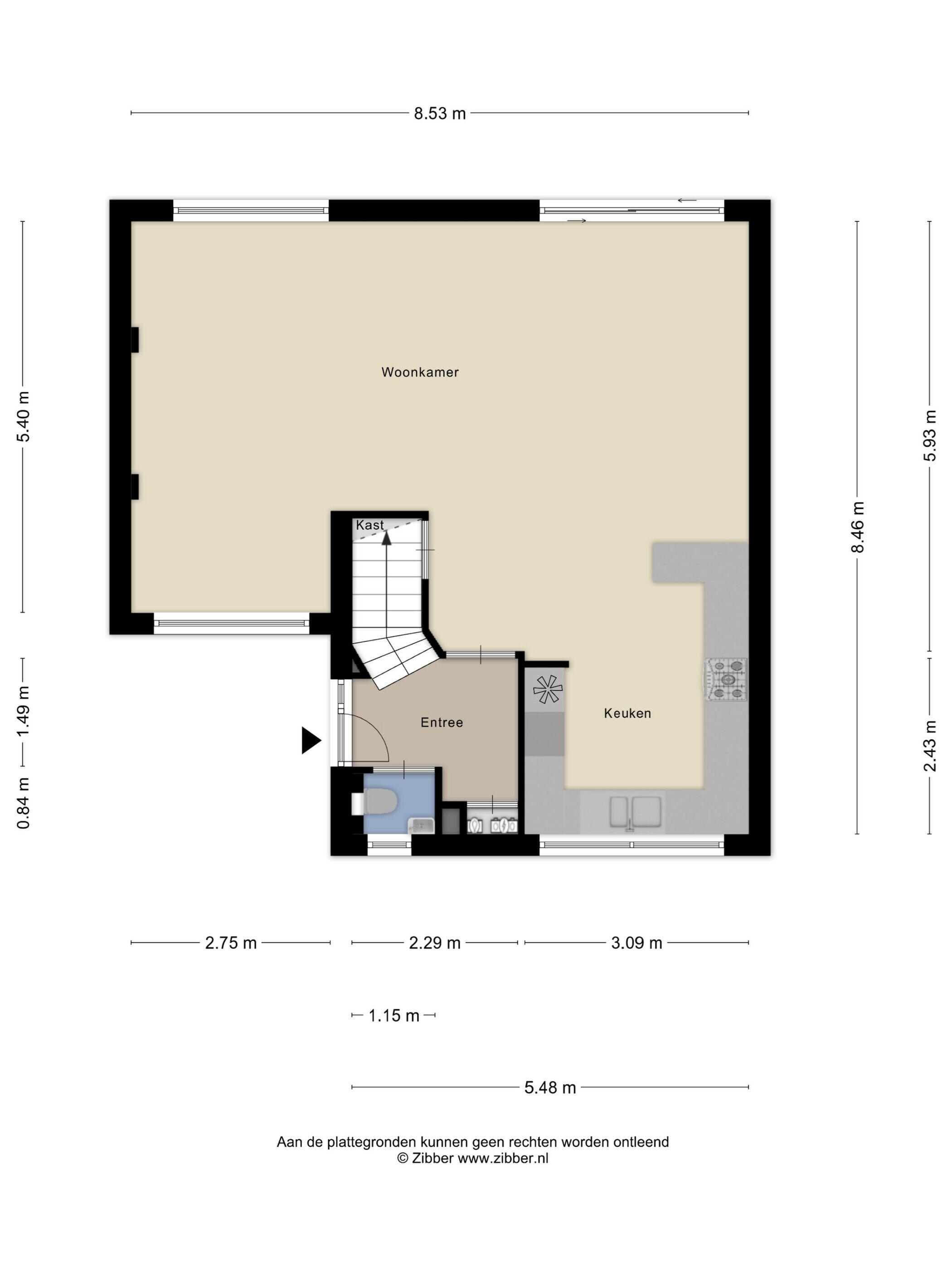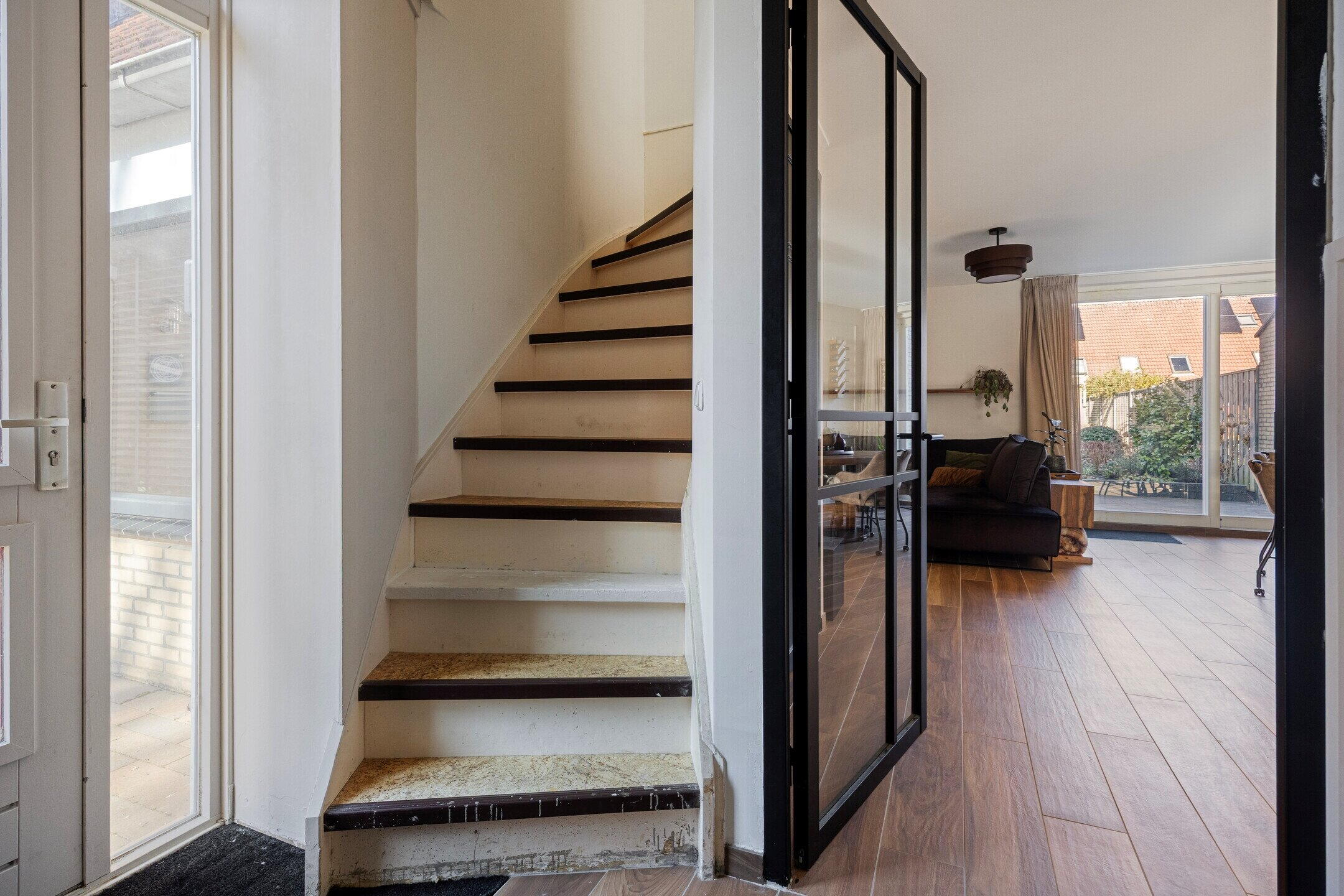 Via de entree komt u binnen in de hal met het vernieuwde toilet en de trapopgang naar de verdieping. Vanuit de hal bereikt u de open keuken.
